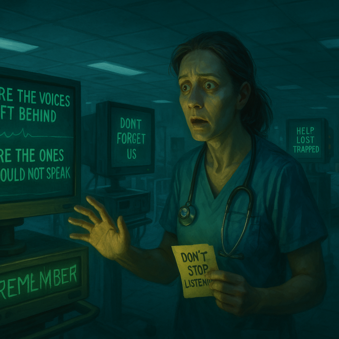 While working the quiet graveyard shift in the emergency room, Nurse Carla’s routine is shattered when all sound mysteriously vanishes, replaced by cryptic, desperate messages flashing across the patients’ heart monitors.