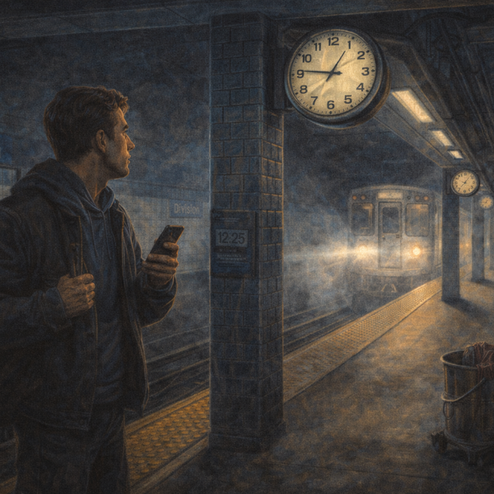 After missing his train by the usual five minutes, a habitually late man finds himself trapped in a hauntingly empty subway station where the clocks have stopped, the passengers have his own face, and the next stop is always the same.