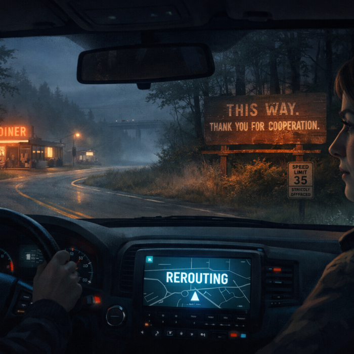 When a skeptic’s GPS begins forcing her onto eerie, out-of-time detours, she discovers that her navigator isn’t just avoiding traffic—it’s navigating the “outcomes” of her life.